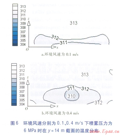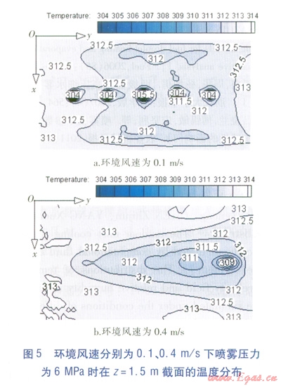 模擬結(jié)果顯示,在相同環(huán)境風(fēng)速下,3種噴霧壓力的降溫范圍與降溫幅度沒有明顯差別,說明在模擬的噴霧壓力范圍內(nèi),噴霧壓力對降溫效果的影響很小,不如環(huán)境風(fēng)速對降溫效果的影響明顯。