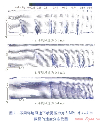 不同環(huán)境風(fēng)速下,噴霧壓力為6MPa時x=4m截面的溫度、速度分布云圖分別見圖3、4。由圖3、4可知,在來流空氣與噴霧引起的氣流的綜合作用下,環(huán)境風(fēng)速不同時模型空間呈現(xiàn)出不同的溫度、速度分布。
