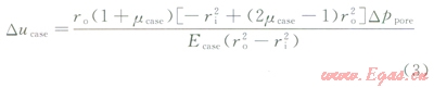 由假沒④可知,初凝前水泥漿處于塑性狀態(tài),具有塑性變形能力。因此在壓力作用下不會出現(xiàn)固井一二界面,即井壁圍巖水泥漿套管三者緊密相連。當(dāng)水泥漿發(fā)生塑性體積收縮時,孔隙壓力下降,地層巖石和套管由于受到的徑向壓力降低而發(fā)生彈性恢復(fù)變形。因此分析水泥漿塑性體積收縮對孔隙壓力下降的影響時可從套管位移變化、井壁圍巖位移變化和孔隙壓降下的水泥漿體積膨脹等3方面進(jìn)行分析。