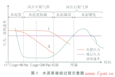 隨著水化反應(yīng)的進(jìn)行,液態(tài)水泥漿逐漸凝固成固態(tài)水泥石需經(jīng)歷液相、膠凝、凝固和硬化等4個階段[15](圖1)。液態(tài)水泥漿能夠完全傳遞孔隙壓力,不會發(fā)生氣竄;膠凝態(tài)水泥漿不斷形成膠凝結(jié)構(gòu),發(fā)生塑性體積收縮,引起孔隙壓力逐漸降低;初凝后,水泥漿進(jìn)入凝固、硬化階段,表現(xiàn)出固態(tài)特征,滲透率極低,能有效阻止水泥環(huán)本體氣竄[16-17]。南上述研究分析可知,固井早期氣竄包括兩個階段:靜膠凝強度過渡時間(T1至T2);靜膠凝強度過渡時間結(jié)束時刻至初凝(T2至初凝)。