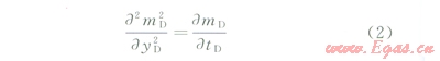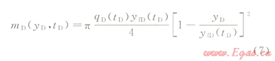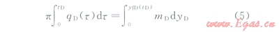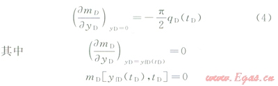 由于探測邊界yfD隨時間而變化,直接求解(2)~(4)并非易事,這里采用近似求解方法。首先對控制方程(2)兩側先后關于空間變量(yD)和時間變量(tD)進行積分,利用邊界條件將偏微分方程式(2)轉化為探測邊界內物質平衡方程: