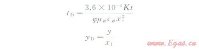 式中K為滲透率,mD;h為地層厚度,m;j為地層孔隙度;mg為氣體黏度,mPa·s;Bg為氣體體積系數(shù);cg為氣體壓縮系數(shù),Mpa-1;Zg為氣體偏差因子;T為地層溫度,K;y為空間坐標,m;yf為動邊界空間位置,m;xf為裂縫半長,m;qsc為氣井產量,m3/d;qref為參考產量,m3/d;Gp為累積產量,m3;p為地層壓力,MPa;t為生產時間,h;下標sc為標準狀態(tài),psc=0.1MPa,Tsc=293.15K;下標i為地層原始狀態(tài);下標D為無量綱量。