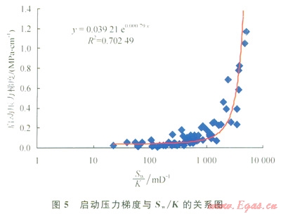 當(dāng)Sw/K小于1000mD-1時(shí),啟動(dòng)壓力梯度較低,當(dāng)Sw/K大于1000mD-1以后,啟動(dòng)壓力梯度顯著增大。因此,對(duì)致密氣藏來說,由于K值小,在較低的含水飽和度時(shí)就可能存在較大的啟動(dòng)壓力梯度,使致密氣藏在開發(fā)過程中需要建立較大的壓差生產(chǎn),克服由毛細(xì)管壓力產(chǎn)生的氣體滲流阻力,儲(chǔ)層含水越高,氣體滲流能力越差,氣藏開發(fā)越困難。