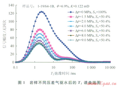 經(jīng)過成藏作用后,巖石孔隙中各類孔、喉中均有水的賦存,其賦存狀態(tài)受控于孔喉大小、形狀以及巖石表面物理性質(zhì)等[12],對(duì)于氣藏儲(chǔ)層來說,一般在細(xì)小孔喉處賦存的水較多。通過巖樣飽和水后進(jìn)行氣驅(qū)水和核磁共振實(shí)驗(yàn),分析了登婁庫組巖石中水的賦存特征。巖樣含水飽和度為100%時(shí)測試的核磁共振T2譜曲線反映的是孔隙內(nèi)全部水體積,曲線下包面積代表了巖樣的全部孔隙體積。在不同壓差氣驅(qū)水后(氣驅(qū)水過程的驅(qū)替壓差由小到大逐步增加),巖樣達(dá)到不同含水飽和度,隨著氣驅(qū)壓差的增大,巖樣含水飽和度降低,T2譜曲線下降(圖1),相鄰T2譜曲線之間的面積代表了兩條曲線對(duì)應(yīng)驅(qū)替壓力變化所引起的可動(dòng)流體變化量,因此由相鄰T2譜曲線之間的面積分布及大小可看出可動(dòng)水來自哪些孔隙及總量多少[13]。