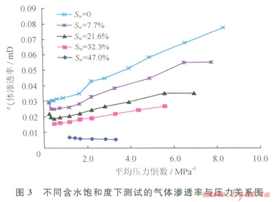 前人研究表明[14-16],致密砂巖中由于復(fù)雜的孔隙結(jié)構(gòu),氣體滲流存在非達(dá)西特征。筆者通過氣驅(qū)水實(shí)驗(yàn)分析表明,當(dāng)驅(qū)替壓差較小時(shí),氣體不能驅(qū)動(dòng)水形成流動(dòng),只有當(dāng)驅(qū)替壓差大于某一臨界值,足以克服水鎖產(chǎn)生的毛細(xì)管阻力才能發(fā)生流動(dòng),這在滲流曲線上表現(xiàn)為啟動(dòng)壓差。對(duì)同一巖樣,其含水飽和度越高,氣體始流動(dòng)所需的驅(qū)動(dòng)壓差越大,氣體開始流動(dòng)后,驅(qū)替壓差越大流量越大;巖樣含水飽和度越低,相同驅(qū)替壓差下流量越大。但是,壓差增大滲透率不一定變大,當(dāng)巖樣含水飽和度較高時(shí),隨著驅(qū)替壓差的增大(平均壓力倒數(shù)減小),氣體滲透率有的增加,有的減??;當(dāng)巖樣含水飽和度較低時(shí),隨著驅(qū)替壓差的增大(平均壓力倒數(shù)減小),氣體滲透率普遍呈先降低后增加的特點(diǎn),這是因?yàn)榍捌谥饕芑撔?yīng)的影響,而后期,當(dāng)平均壓力倒數(shù)低于一定程度后(即驅(qū)替壓差大于一定值后),這時(shí)氣體帶動(dòng)部分孔隙中的水流動(dòng),或使孔隙壁的水膜變薄,氣體滲流通道增加。因此氣體滲透率開始增加(圖3)。含水飽和度越高,這種水的可動(dòng)性對(duì)氣體滲流的影響越明顯。
