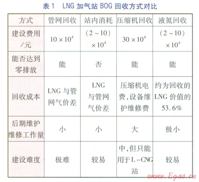 LNG加氣站BOG回收方式對(duì)比見表1。