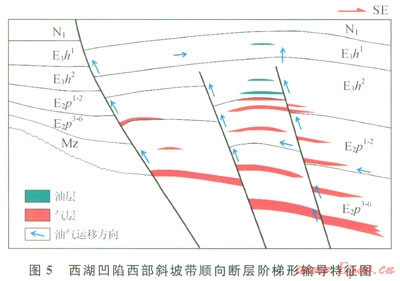 裂陷期同沉積斷裂為油氣垂向運(yùn)移的良好通道。西湖凹陷裂陷階段,張性正斷層發(fā)育,斷層大都具有開啟性,且這一階段發(fā)育的正斷層一般都斷穿下部主要烴源層,成為油氣運(yùn)移主要的通道。如平湖斜坡帶油氣源主要為平湖組及其以下地層,決定了斷層為主要油氣通道,并形成與斷層有關(guān)的構(gòu)造型油氣藏。由于斷層具有良好的垂向輸導(dǎo)能力,??尚纬删酂N源層有較大時(shí)空跨度的含油氣層位,在斷層帶附近可以形成多層疊置的油氣藏。其次,斜坡帶上不整合面為油氣的次主要運(yùn)移通道,可以使油氣進(jìn)行長(zhǎng)距離的側(cè)向和斜向運(yùn)移[5],裂陷期斷裂與不整合面構(gòu)成了網(wǎng)狀的油氣輸導(dǎo)體系(圖5)。