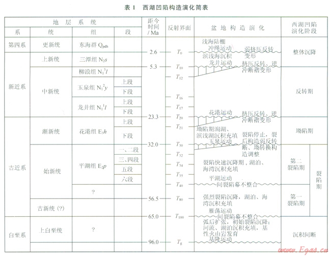 西湖凹陷以新生代碎屑沉積為主,凹陷中心最大沉積厚度可超過(guò)15000m。自下而上依次發(fā)育始新統(tǒng)平湖組以下地層(由于缺少鉆井、測(cè)井、同位素、古生物等資料,地層屬性尚難確定一古新統(tǒng)?)、古近系始新統(tǒng)平湖組(E2p)、漸新統(tǒng)花港組(E3h)、新近系中新統(tǒng)龍井組(N11l)、中新統(tǒng)玉泉組(N12y)、中新統(tǒng)柳浪組(N13l)、上新統(tǒng)三潭組(N2s)以及第四系的東海群(Qpdh)(表1)。