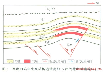 總之,裂陷期斷裂作為烴源斷層其所斷達(dá)層位多是油氣的富集層位;而烴源斷層沒(méi)有斷達(dá)的層位,油氣難以進(jìn)一步向上運(yùn)移。如西湖凹陷中央反轉(zhuǎn)構(gòu)造帶南部A油氣藏,斷層斷達(dá)的層位油氣較為富集,而淺層由于缺少斷層輸導(dǎo),油氣難以向上運(yùn)移聚集(圖6),油氣顯示情況較差。