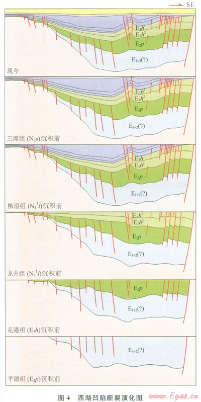 4)晚中新世至第四紀(jì),斷裂活動(dòng)基本停止,僅在南北向剖面上發(fā)育部分張剪性斷層,斷層對(duì)地層的控制作用不顯著,該時(shí)期為西湖凹陷的整體沉降期。