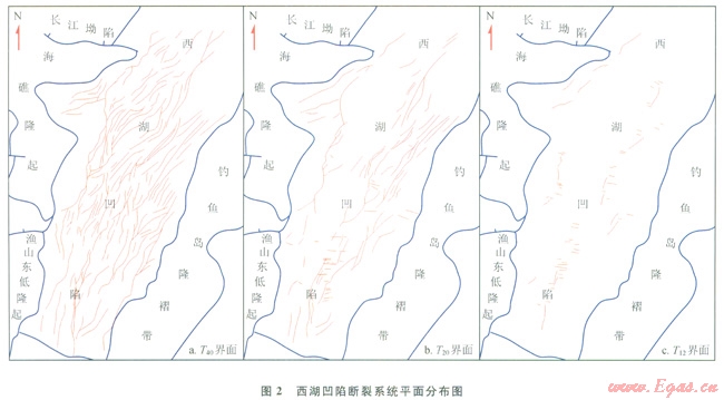 結(jié)合凹陷構(gòu)造演化階段、斷層活動(dòng)時(shí)間、斷開層位等特征,可將西湖凹陷斷裂系統(tǒng)劃分為:裂陷期斷裂(盆地開始接受沉積—始新世)、坳陷—反轉(zhuǎn)期斷裂(漸新世—中新世)和區(qū)域沉降期斷裂(上新世—現(xiàn)今),分別對(duì)應(yīng)下(張性)、中(壓性)、上(張剪)3套斷裂系統(tǒng)。3套斷裂系統(tǒng)各有其獨(dú)特的演化過(guò)程,并與凹陷特定的構(gòu)造背景有關(guān)。