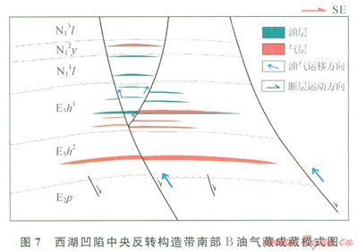 在中央反轉(zhuǎn)構(gòu)造帶南部花港組下段,近E—W向斷層與NE向斷層多有分布,2套斷層共存的過(guò)渡層段厚度可達(dá)1000m,既可以通過(guò)下部斷層作為油氣運(yùn)移通道獲得油氣,又可在上、下部斷層的末端,即應(yīng)力衰退區(qū)有利于油氣聚集成藏。幕式的斷層活動(dòng)或新的斷層活動(dòng),也提供了油氣從下部成熟烴源巖體中排出和運(yùn)移的動(dòng)力。