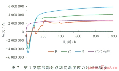 圖7為第l澆筑層部分點環(huán)向溫度應(yīng)力時程曲線。由圖7可知,在外罐施工期間,混凝土先受壓后受拉,在混凝土澆筑68h后,混凝土由受壓狀態(tài)轉(zhuǎn)變?yōu)槭芾瓲顟B(tài),在混凝土澆筑120h后,第1澆筑層底部某點所受拉應(yīng)力超過了混凝土的抗拉強度,底部混凝土開始產(chǎn)生溫度裂縫。B點應(yīng)力曲線存在上下波動是由于B點易受上層新澆筑混凝土的影響;比較B、C、E點應(yīng)力時程曲線可知,混凝土離罐底越近,產(chǎn)生的溫度應(yīng)力越大。