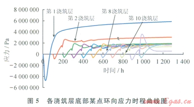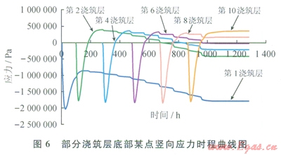 圖5為各澆筑層底部某點環(huán)向應(yīng)力時程曲線,圖6為部分澆筑層底部某點豎向應(yīng)力時程曲線。由圖5可知,在LNG儲罐外罐施工期間,溫度應(yīng)力分為壓應(yīng)力發(fā)展、壓應(yīng)力轉(zhuǎn)變?yōu)槔瓚?yīng)力及拉應(yīng)力趨于殘余應(yīng)力3個階段。比較圖5和圖6可知,混凝土外罐在溫度及重力荷載作用下,第一主應(yīng)力為環(huán)向應(yīng)力,與彈性力學(xué)理論分析的結(jié)果相符,而且現(xiàn)場施工經(jīng)驗表明混凝土外罐在施工期間底部經(jīng)常產(chǎn)生豎向裂縫。由圖5還可知,第1澆筑層所受的溫度應(yīng)力明顯大于其他澆筑層,產(chǎn)生這種狀況的原因是第1澆筑層混凝土受到罐底的約束度相對較大;因第3~9澆筑層澆筑高度及約束狀況相近,所以其應(yīng)力變化曲線相似;第10澆筑層環(huán)向應(yīng)力曲線因受環(huán)梁澆筑的影響而產(chǎn)生2MPa的應(yīng)力波動。