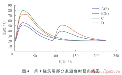 第1澆筑層部分點溫度時程曲線如圖4所示。由圖4可知,在外界恒溫條件下,混凝土內(nèi)部溫度在其澆筑約ld后迅速達(dá)到峰值,之后開始緩慢降溫,在其澆筑約10d后趨于穩(wěn)定。由圖4還可知,外罐罐壁厚度中心最高升溫約為60℃,混凝土易產(chǎn)生深層裂縫;混凝土內(nèi)部與表面溫差為25℃,混凝土表面具有開裂的危險;頂部}昆凝土塊內(nèi)部溫度受上層新澆筑混凝土的影響比較大。因此A、B測點在溫度下降階段有20~30℃的溫度波動,數(shù)值分析表明,新澆筑混凝土對下層混凝土的影響深度約為1.2m。