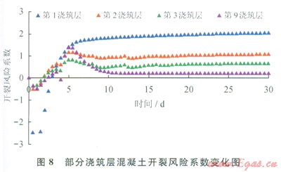 有限元分析時,采用式(6)對各澆筑層裂縫開裂情況進(jìn)行判斷,取1、2、3、9澆筑層外壁底部某點為監(jiān)測點,各澆筑層在混凝土澆筑后開裂風(fēng)險系數(shù)變化如圖8所示,第l澆筑層的開裂風(fēng)險系數(shù)明顯大于1,將產(chǎn)生溫度裂縫;第2澆筑層開裂風(fēng)險系數(shù)接近0.8,混凝土具有產(chǎn)生溫度裂縫的危險;第9澆筑層受環(huán)梁澆筑影響,在混凝土澆筑5d時將產(chǎn)生溫度裂縫;其他澆筑層混凝土產(chǎn)生溫度裂縫的可能較小。由圖8還可知,各澆筑層在混凝土澆筑完成6d時,混凝土的開裂風(fēng)險最大。