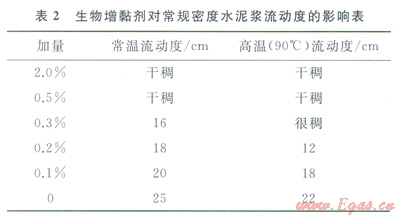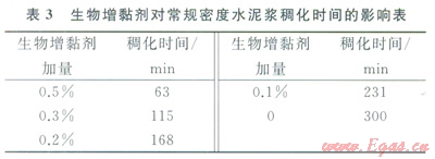 生物增黏劑對常規(guī)密度水泥漿常規(guī)性能的影響見表2、3。