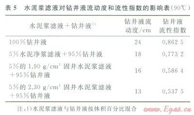 由表5可知,當(dāng)將3種水泥漿濾液加入鉆井液后,均出現(xiàn)流動(dòng)度迅速下降,流性指數(shù)明顯降低的現(xiàn)象。隨著水泥漿濾液比例的增加,流動(dòng)度與流性指數(shù)下降的趨勢更加明顯。