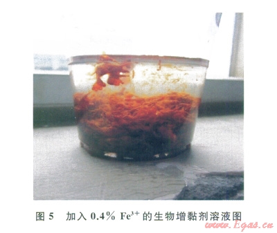 配制0.5%生物增黏劑溶液(圖4),分別在其中加入0.1%、0.2%、0.3%、0.4%、0.5%的FeCl3、CaCl2、AlC13、MgCl3,結(jié)果如下:①加入Al3+后,溶液迅速生成大量半透明白色獨(dú)立的小粒徑球狀凝膠,里面包裹了大量的水,隨著加量增大,凝膠量不斷增多,直到加量0.4%后不再變化;②加入Fe3+后,溶液迅速生成大量棕黃色獨(dú)立的小粒徑球狀凝膠,里面包裹了大量的水,隨著加量增大,凝膠體積不斷增大,直到加量0.4%后不再變化(圖5);③加入Mg2+和Ca2+后溶液無明顯變化。