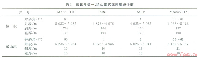 MX5、MX2井為直井,梁山組厚度分別為10m、16m。MX005-H1為大斜度水平井,梁山組井斜60°,斜厚l9m,折算垂厚10m。設(shè)計(jì)的MX005-H2井棲一段、梁山組垂厚分別為100m、10m。設(shè)計(jì)以55°~61°井斜角鉆開(kāi)石炭系,斜厚分別折算為187m、21m(表1)。