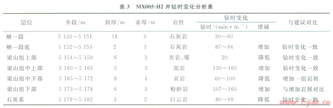采用了鄰井實(shí)鉆巖性組合為依據(jù),把鉆時(shí)錄井作為判斷鉆頭進(jìn)入梁山組,巖屑錄井及循環(huán)觀察作為判斷鉆遇巖性的手段。如某石炭系氣藏的待鉆井MX005-H2井的3口鄰井,MX5、MX005-H1井位于構(gòu)造高點(diǎn),MX2井位于潛伏高點(diǎn)。待鉆井與MX005-H1井距離281m。所以,工程應(yīng)用地層、巖性數(shù)據(jù)主要參考MX005-Hl、MX5井實(shí)鉆數(shù)據(jù)。