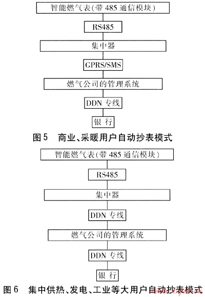 特點(diǎn):商業(yè)用戶主要包括酒店、餐廳等,常年用氣,用戶分散,流量通常在500m3/h以下。采暖、制冷用戶主要是季節(jié)性用氣大戶,而且在采暖、制冷期實(shí)行不同的燃?xì)鈨r(jià)格機(jī)制,流量通常為500~5000m3/h。此類用戶的數(shù)量比居民用戶少得多,但用氣量卻遠(yuǎn)大于居民用戶。建議采用圖5所示的自動(dòng)抄表模式。