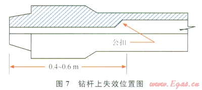 至于這種失效為什么往往發(fā)生在母扣接頭以下0.4~0.6m處,且剛好處于鉆具的加厚帶區(qū)域。追溯鉆桿生產(chǎn)工藝[10]便知:管體材質(zhì)、接頭和焊縫均已不是現(xiàn)代鉆桿生產(chǎn)的瓶頸,加厚帶及其附近位置已變?yōu)殂@具最主要的應(yīng)力集中點,因而也是最易發(fā)生疲勞損壞的位置,API及IADC數(shù)據(jù)庫[11]顯示大多數(shù)鉆具的失效都發(fā)生在接頭兩端加厚帶的位置(圖7、8)。