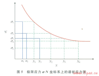 筆者涉及的疲勞破壞就屬于疲勞損傷累積,損傷累積法的理論基礎(chǔ)是Miner法則[8]。Miner法則認為:根據(jù)s-N曲線的定義,在恒定應(yīng)力幅(s)的作用下,構(gòu)件運轉(zhuǎn)循環(huán)次數(shù)為N時,將產(chǎn)生完全損傷即失效。那么構(gòu)件在應(yīng)力s作用下運轉(zhuǎn)一個比N次數(shù)小的n時,將產(chǎn)生部分損傷,同時假定在這一過程中每一次損傷相同,則在s的作用下,損傷概率為n/N,如果一個構(gòu)件在包含不同應(yīng)力(sj),將產(chǎn)生一個不同的損傷率nj/Nj,當這些損傷概率總和達到1時,就可以預(yù)測出現(xiàn)失效,也就是說: