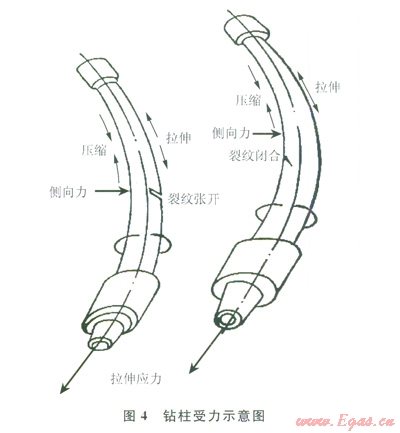 1930年,英國人古德曼(J.Goodman)簡化了疲勞極限的曲線圖[6],根據(jù)他的疲勞理論可以得出,鉆桿的疲勞強度不僅與鉆桿自身的性能有關(guān),而且與其承受的平均應(yīng)力即拉伸應(yīng)力有關(guān),拉伸應(yīng)力越大,鉆桿疲勞所需的最低彎曲應(yīng)力幅越小,所以井越深、鉆桿越靠近井口,鉆桿就容易發(fā)生疲勞,其受力情況見示意圖4。