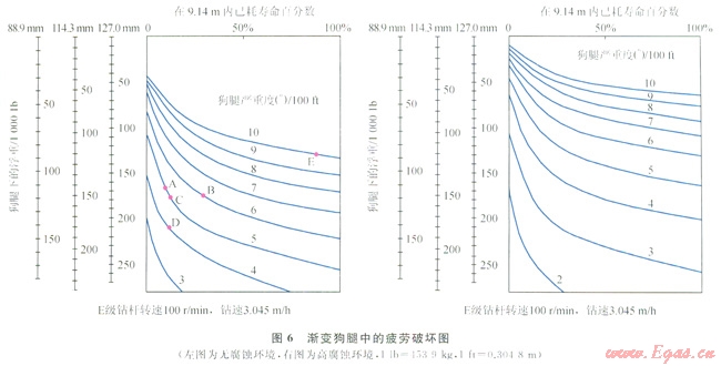 其后Hansford和Lubinski提出過一種簡易的方法來估算鉆桿通過狗腿段后的累積疲勞損傷,定制了腐蝕介質(zhì)和非腐蝕介質(zhì)中E級鉆桿在不同狗腿嚴重度和拉力下消耗的壽命[9](圖6,參見GB/T 24956—2010《石油天然氣工業(yè)鉆柱設(shè)計和操作限度的推薦作法》第68頁)。在不同轉(zhuǎn)速和鉆速情況下,可用下面公式進行校正。