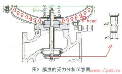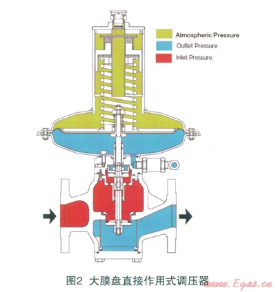 該款調壓器為某進口品牌,在我公司大量使用,其質量和性能較為穩(wěn)定,一直沒有出現過問題。該款調壓器為大膜盤直接作用式調壓器,其連接口徑DN80,膜盤頭部直徑為書600,其結構型式平衡閥芯式調壓器,閥瓣位于閥座下部,是典型的失效開啟型調壓器,在主皮膜破裂或壓力信號管無壓力反饋時,閥口處于開啟狀態(tài)。大膜盤調壓器的特點是結構簡單、響應迅速、關閉精度高,由于大膜盤的作用,其關閉精度很高,當下游壓力高于設定值時,閥口關閉密封性好,無流量泄漏。其結構見圖2。