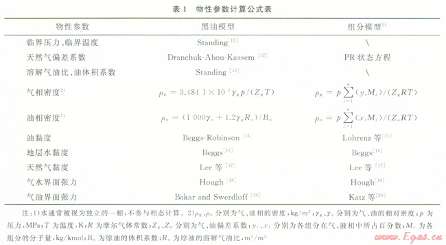 流體物性參數(shù)計(jì)算””是凝析氣井井筒壓降計(jì)算的基礎(chǔ)。目前主要包括:①黑油模型。通過優(yōu)選經(jīng)驗(yàn)公式計(jì)算溶解氣油比、天然氣偏差系數(shù)、天然氣體積系數(shù)等參數(shù)。②組分模型。通過狀態(tài)方程計(jì)算流體密度、黏度、界面張力等。筆者所采用的主要計(jì)算模型如表1所示。
