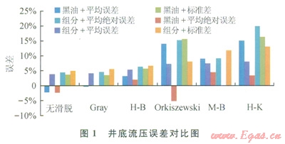 從統(tǒng)計(jì)誤差看,Gray模型各項(xiàng)最小(圖3),組分模型計(jì)算誤差略大于黑油模型。這是由于Gray模型的持液率計(jì)算過程中考慮了凝析油的反凝析現(xiàn)象,而組分模型再引入相態(tài)方程,使凝析現(xiàn)象疊加導(dǎo)致組分模型計(jì)算壓力較黑油模型對(duì)中性略差,誤差增加。因此推薦Gray模型按黑油模型計(jì)算凝析氣井井筒壓力。