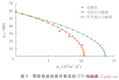 根據(jù)氣藏實(shí)際資料,計(jì)算得上覆地層壓力為61.0MPa,油藏壓力為58.2MPa,結(jié)合筆者推導(dǎo)的公式對(duì)產(chǎn)能進(jìn)行分析,其結(jié)果如圖5所示。從圖5中可看出,該氣藏應(yīng)力敏感效應(yīng)嚴(yán)重,應(yīng)力敏感效應(yīng)引起的氣井無(wú)阻流量損失在23%左右。從產(chǎn)能測(cè)試數(shù)據(jù)分析,考慮應(yīng)力敏感效應(yīng)的產(chǎn)能方程更符合實(shí)際產(chǎn)能測(cè)試。因此對(duì)鶯歌海盆地異常高壓氣藏在產(chǎn)能評(píng)價(jià)時(shí)應(yīng)考慮應(yīng)力敏感效應(yīng),綜合分析確定該氣藏單井合理工作制度,盡量減少應(yīng)力敏感效應(yīng)對(duì)單井產(chǎn)量造成的損失。