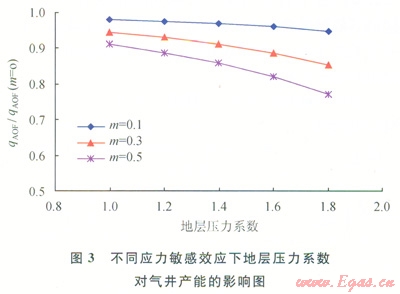 在油氣藏開發(fā)過(guò)中,儲(chǔ)層有效應(yīng)力可表述為上覆地層壓力與孔隙壓力之差,在一定的上覆地層壓力情況下,儲(chǔ)層有效應(yīng)力只與地層壓力有關(guān),儲(chǔ)層有效應(yīng)力將會(huì)隨著地層壓力系數(shù)變化而變化。如圖3所示,在同樣的生產(chǎn)條件下,地層壓力系數(shù)越大的氣藏(即越具有高異常壓力顯著特征的氣藏),開發(fā)過(guò)程中應(yīng)力敏感效應(yīng)將越嚴(yán)重,單井產(chǎn)能損失越大。