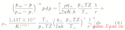 式中qsc為標(biāo)準(zhǔn)狀況下氣井產(chǎn)量,104m3/d;h為氣層射開有效厚度,m;`m為平均地層壓力及溫度下氣體的黏度,mPa·s;`Z為平均地層壓力及溫度下氣體的偏差系數(shù);rsc為標(biāo)準(zhǔn)狀況下氣體密度,g/cm3;T為地層溫度,℃;Tsc為標(biāo)準(zhǔn)狀況下溫度,℃;psc為標(biāo)準(zhǔn)狀況下壓力,MPa;pob為儲(chǔ)層上覆壓力,MPa;pi為儲(chǔ)層原始地層壓力,MPa;pe為儲(chǔ)層目前地層壓力,MPa;p為泄油半徑處地層壓力,MPa;pwf為井底流壓,MPa;r為徑向半徑,m;re為泄油半徑,m;rw為井筒半徑,m。