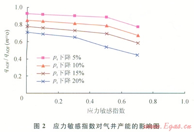 應(yīng)力敏感指數(shù)對(duì)氣井無(wú)阻流量的影響如圖2所示,可見氣井無(wú)阻流量隨應(yīng)力敏感指數(shù)的增大損失將越大。即說(shuō)明實(shí)際應(yīng)力敏感氣藏開發(fā)生產(chǎn)過(guò)程中,越具有強(qiáng)應(yīng)力敏感效應(yīng)的氣藏,應(yīng)力敏感效應(yīng)越嚴(yán)重,氣井產(chǎn)能相對(duì)損失就越大。