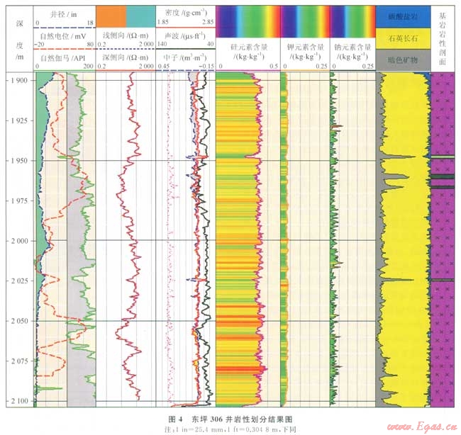 巖心資料、元素俘獲測(cè)井和常規(guī)曲線的結(jié)合給出了東坪氣田基巖儲(chǔ)層的巖性識(shí)別與劃分結(jié)果,表明北部的3區(qū)以花崗巖為主,夾有薄層的中基性侵入巖脈,侵入巖脈的厚度多在1~3m之間(圖4),與計(jì)算的孔隙度等參數(shù)對(duì)比,認(rèn)為侵入巖脈可作為儲(chǔ)層,且由于侵入主要是沿?cái)鄬拥冗M(jìn)行的,侵入過(guò)程誘導(dǎo)裂縫產(chǎn)生。因此巖脈的侵入對(duì)于儲(chǔ)層是一個(gè)積極的因素。南部的l區(qū)基巖以變質(zhì)巖為主,圖4是北部東坪306井的巖性劃分結(jié)果。位于區(qū)塊東北角的該井為鈣質(zhì)片麻巖,區(qū)塊內(nèi)已鉆的其他井多為花崗片麻巖和斜長(zhǎng)片麻巖,結(jié)合孔隙度、裂縫等參數(shù)分析認(rèn)為巖性對(duì)物性的控制作用不明顯,這3種不同類(lèi)型的變質(zhì)巖都可以發(fā)育好的儲(chǔ)層。
