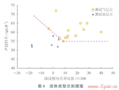 采用深、淺側(cè)向的差異同深電阻率的比值與聲波的交會(huì)圖來(lái)確定流體性質(zhì)(圖6)。從圖6中看出氣層點(diǎn)都位于右上方,而水層點(diǎn)位于左下方,從測(cè)井的原理上看含氣好的層段深淺側(cè)向有較大的正差異特征或者小的負(fù)差異,而水層由于淡水鉆井液的侵入會(huì)使得電阻率出現(xiàn)負(fù)差異,當(dāng)然裂縫的發(fā)育情況及產(chǎn)狀對(duì)電阻率的影響比較大,但從解釋結(jié)果看都是以網(wǎng)狀裂縫為主。因此認(rèn)為電阻率的差異與流體類(lèi)型存在一定的聯(lián)系。
