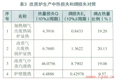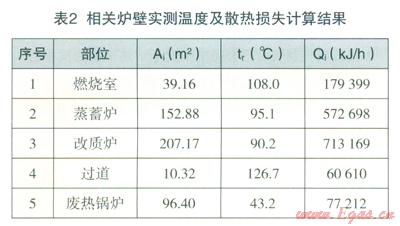 吳煤公司的天然氣改質(zhì)爐是常壓改質(zhì)爐,該工藝過程的熱效率76.37%,生產(chǎn)城市燃?xì)庑?span lang="EN-US">84.74%。對照國內(nèi)常壓改質(zhì)爐生產(chǎn)數(shù)據(jù),屬于較好水平生產(chǎn)燃?xì)?。這種能源轉(zhuǎn)換設(shè)備不同于其他燃?xì)馍a(chǎn)設(shè)備,無固體灰渣排出,因此,熱量損失評價可以從排煙熱損失(顯熱損失和化學(xué)不完全燃燒熱損失)及爐肇散熱損失進(jìn)行考察。測試數(shù)據(jù)顯示,僅有部分爐體外壁溫度有所偏高,較易克服以減少熱量損失。從占熱量損失的比值來看分別為機(jī)械發(fā)生爐為45%,鍋爐為59.53%,天然氣改質(zhì)爐為18.52%,由此可見,天然氣改質(zhì)爐的能源轉(zhuǎn)換和熱量利用最好。