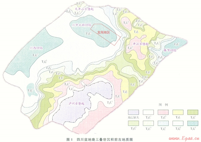 中三疊世末,伴隨著印支運動的發(fā)生,地臺整體抬升形成大規(guī)模的海退,上揚子地臺由此結束了以海相沉積為主的歷史,進入以陸相沉積為主的時期,地層遭受剝蝕。在此過程巾形成了隆起與凹陷,盆地內展現(xiàn)為三隆三凹的格局(圖1)。三隆指南側瀘州古隆起、北側開江古隆起以及北西邊緣廣元江油附近的天井山古隆起,三凹是指川西凹陷(包括德陽—成都—大邑—邛崍—眉山—雅安地區(qū)和樂山—犍為地區(qū))、川中北部凹陷(包括蒼溪—閬中—儀隴地區(qū))和川東北的奉節(jié)凹陷。隆起中心地層遭受剝蝕程度大,瀘州古隆起頂部雷口坡組剝蝕殆盡,開江占隆起殘存雷一段,在凹陷內剝蝕程度相對較弱,均保留了雷四段。