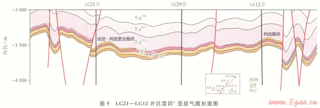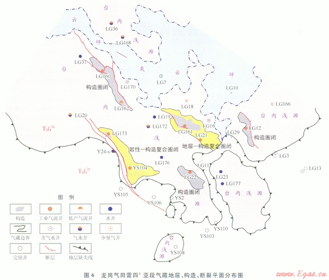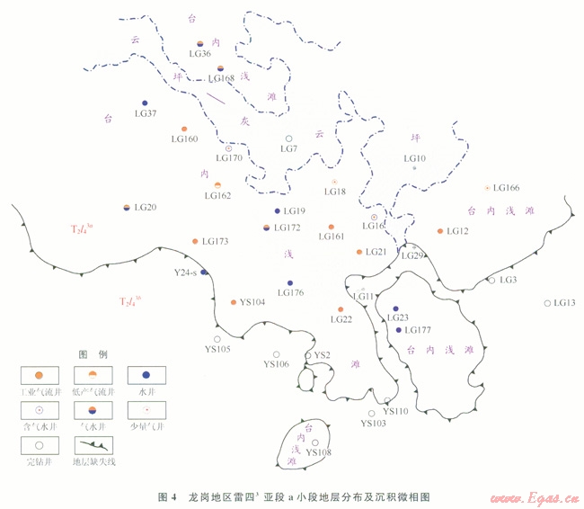 3)在大型地層尖滅的背景上,受構造、斷層和巖性變化影響,發(fā)育地層 構造、巖性一構造等多種圈閉類型。雷四3亞段a小段尖滅帶附近的次級巖溶斜坡是尋找工業(yè)氣井的最有利區(qū)。