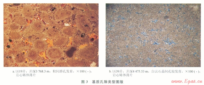 儲層基質孔隙類型有粒間溶孔、晶間溶孔、粒內溶孔、鑄??缀腕w腔孔,其中粒間溶孔、晶間溶孔是主要的孔隙類型,其發(fā)育程度直接影響到儲層的儲集能力。