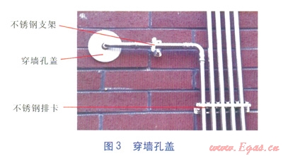 為避免填充材料對(duì)穿墻薄壁不銹鋼管的腐蝕,穿墻部分管道一般用防腐粘膠帶進(jìn)行纏裹,但此工序耗時(shí)且質(zhì)量受施工工人人為因素影響較大。在試點(diǎn)工作中特委托產(chǎn)品供應(yīng)商對(duì)穿墻部分直管段進(jìn)行覆塑處理,并以成品管件形式提供(見圖2)。