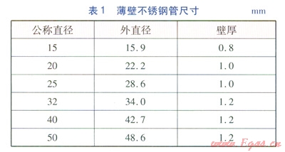 薄壁不銹鋼管材、管件的材料牌號(hào)及化學(xué)成分應(yīng)符合GB/T l2771—2008《流體輸送用不銹鋼焊接鋼管》(以下簡(jiǎn)稱GB/T l2771—2008)、GB/T19228.1—2011《不銹鋼卡壓式管件組件第l部分卡壓式管件》(以下簡(jiǎn)稱GB/T l9228.1—2011)和GB/T l9228.2—201 1《不銹鋼卡壓式管件組件第2部分 連接用薄壁不銹鋼管》(以下簡(jiǎn)稱GB/T19228.2—2011)的規(guī)定,材料牌號(hào)為06Crl9Nil0(統(tǒng)一數(shù)字代號(hào)為$30408)。根據(jù)外直徑的不同,薄壁不銹鋼管材分為Ⅰ系列和Ⅱ系列兩種規(guī)格,考慮到Ⅰ系列的管材外直徑規(guī)格較多,不易與管件相匹配,故在試點(diǎn)工作中選用Il系列管材與管件。本次試點(diǎn)工作中使用的薄壁不銹鋼管最大公稱直徑為50mm,且選用壁厚較大的管道,推薦使用的薄壁不銹鋼管尺寸見表1。