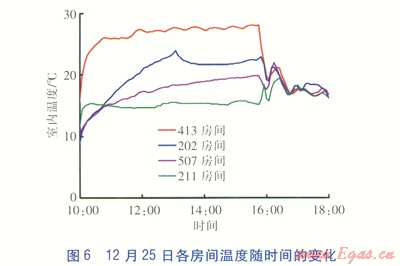 12月25日室內(nèi)溫度從l0:00的15.69℃上升至15:45的28.06℃,之后開(kāi)始下降。截至18:00,室內(nèi)溫度為16.81℃。房間相對(duì)濕度很低,約l0%左右,至l5:50開(kāi)始相對(duì)濕度突然有所增加,并逐步上升到20%。