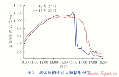 筆者采用江億提出的隨機(jī)氣象模型[2],模擬計(jì)算測(cè)試日逐時(shí)太陽(yáng)輻射強(qiáng)度。模型考慮了天氣變化對(duì)太陽(yáng)輻射強(qiáng)度的影響,通過(guò)判定得出逐時(shí)天氣狀況,針對(duì)不同天氣情況采用相應(yīng)的模型確定太陽(yáng)輻射強(qiáng)度。l2月25日為全天晴朗的天氣,l2月27日為晴轉(zhuǎn)陰的天氣,兩日的逐時(shí)太陽(yáng)輻射強(qiáng)度見(jiàn)圖3。由圖3可知,12月25日最大太陽(yáng)輻射強(qiáng)度出現(xiàn)在14:59,為l238W/m2。12月27日最大輻射強(qiáng)度出現(xiàn)在13:33,為l238W/m2。兩日出現(xiàn)最大太陽(yáng)輻射強(qiáng)度的區(qū)間在13:00—15:00。