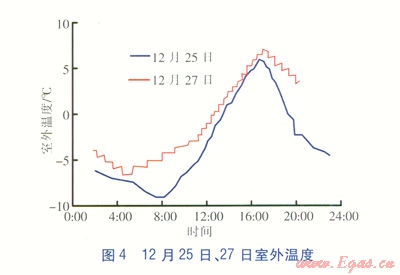 由此可見(jiàn),在正常晴朗天氣下,ll:O0至l8:00,不啟動(dòng)風(fēng)機(jī)盤(pán)管,僅依靠太陽(yáng)能輻射取暖基本可滿(mǎn)足供暖需求。當(dāng)遇到陰雨天氣時(shí),室內(nèi)溫度急劇下降,需開(kāi)啟供暖設(shè)施。