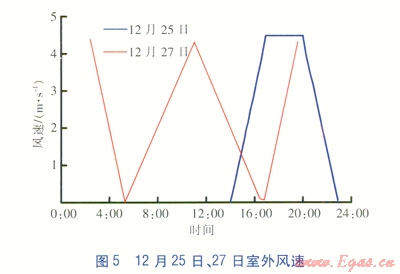 12月25日、27日逐時(shí)室外溫度、風(fēng)速分別見(jiàn)圖4、5。由圖4、5可知,測(cè)試日室外溫度變化趨勢(shì)基本一致。最高室外溫度均出現(xiàn)在16:40左右,25日、27日最高室外溫度分別為5.9、6.6℃。日最低室外溫度基本出現(xiàn)在8:00前后,25日、27日最低室外溫度分別為-9.07、-8.03℃。25日14:O0之后開(kāi)始起風(fēng),風(fēng)速在16:00左右升至4.5m/s;27日全天風(fēng)速變化范圍0~4.5m/s。由實(shí)測(cè)結(jié)果可知,25日、27日室外空氣相對(duì)濕度變化范圍分別為6.04%~24.26%、5.52%~19.38%。