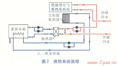 該建筑為拉薩市某多層辦公建筑,建筑共5層,總建筑面積為7500m2,辦公建筑典型層的平面布置見(jiàn)圖1。供暖方式采用以太陽(yáng)能熱水系統(tǒng)為主、空氣源熱泵為輔的形式,室內(nèi)供暖裝置為風(fēng)機(jī)盤(pán)管。供暖室內(nèi)設(shè)計(jì)溫度為20℃,供、回水溫度為45、40℃。供熱系統(tǒng)流程見(jiàn)圖2。乙二醇水溶液經(jīng)過(guò)太陽(yáng)能集熱器(平板形)加熱后進(jìn)入蓄熱水箱,蓄熱水箱出水經(jīng)板式換熱器與供暖回水換熱。若換熱后的水溫低于45℃,低溫型空氣源熱泵啟動(dòng),將水溫加熱至45℃后供給末端風(fēng)機(jī)盤(pán)管;若換熱后的水溫達(dá)到45℃,低溫型空氣源熱泵不啟動(dòng),熱水直接供給末端風(fēng)機(jī)盤(pán)管。
